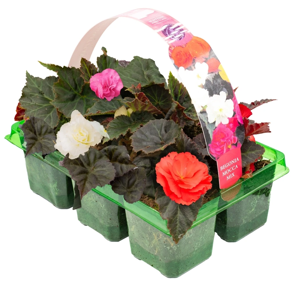 Begonia Mocca Mixed Basket Plants is a gorgeous collection that will brighten up your garden. Their double-flowering blooms are bursting with colour through bright shades of red, pink and yellow. These flower against unique, chocolate bronze foliage that makes for a brilliant contrast throughout Summer into Autumn. This mix is also perfect for any hanging baskets, flower beds, borders, pots or containers.