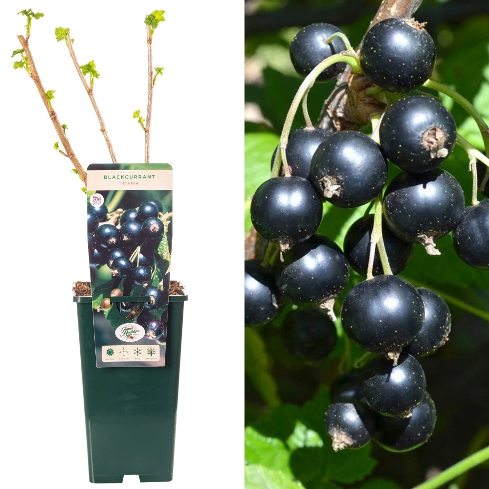 Our Ribes nigrum Titania is an upright, deciduous shrub. Its dark green foliage bears a lovely fragrance from Spring into Summer. The plant will also produce white-pale green flowers in this time, before tasty, edible fruit begins to harvest in late Summer. Once fully grown and ripe, the Blackcurrants will bring a sweet and rich flavour to a variety of everyday meals.