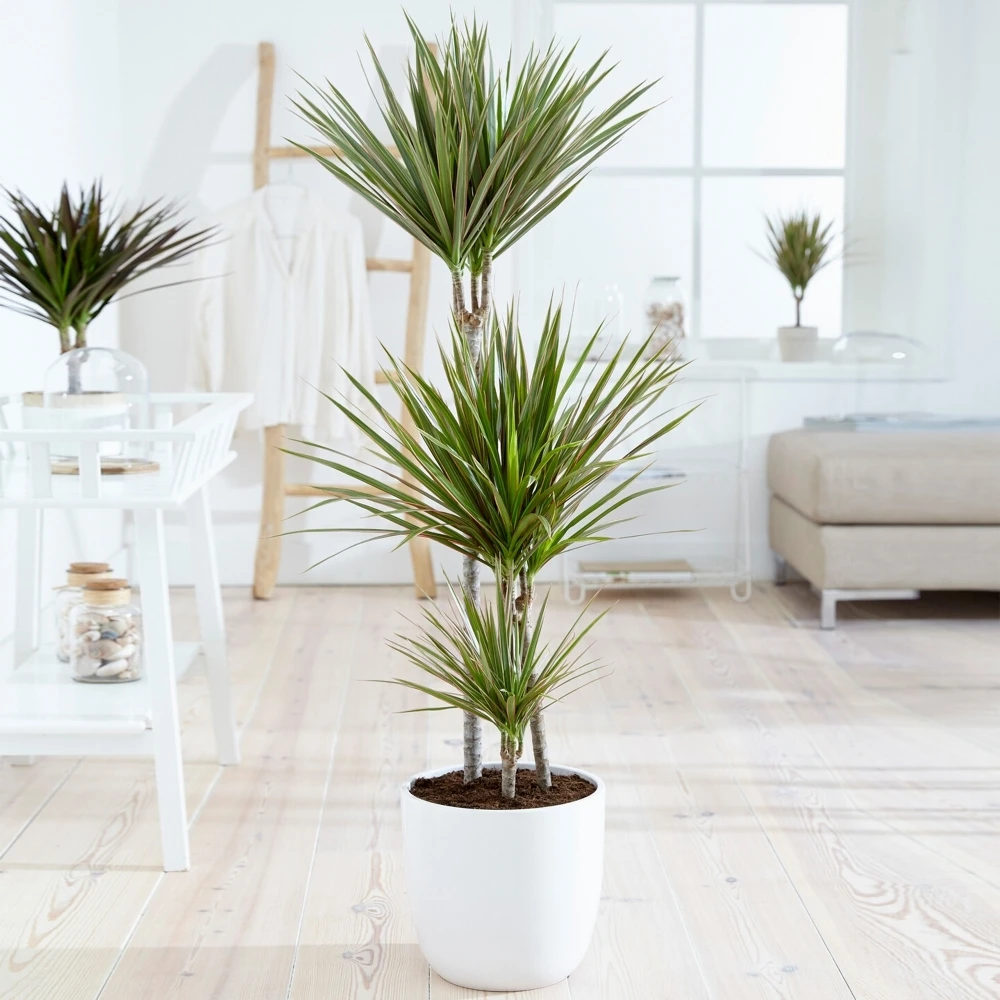 The Dragon Tree, also known as Corn Plant, is a popular indoor plant. Dracaena Marginata comes in a variety of sizes – the tallest we have reaches an impressive 160-180cm! Its slender, bright green foliage is edged with red and forms from the multiple, sturdy, upright stems. A tropical houseplant that tolerates most growing conditions, it also guarantees a standout focal point for many homes and offices across the UK.