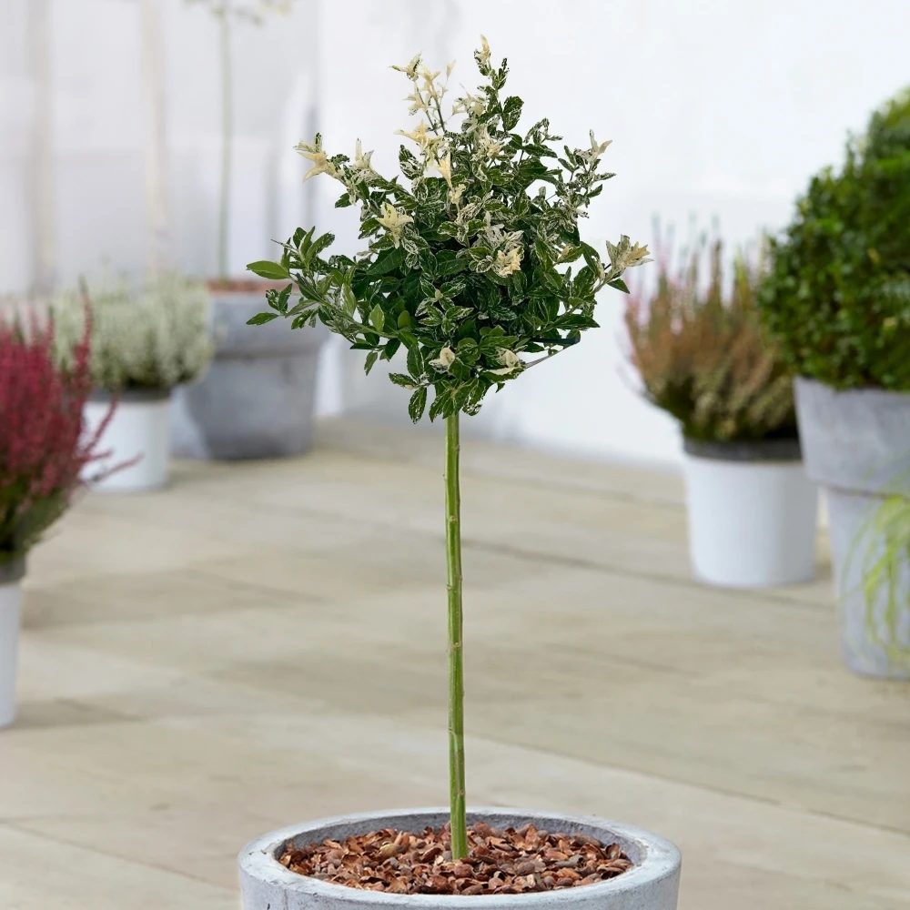 Euonymus Harlequin – also known as spindle tree – grows well in pots and containers and is perfect for brightening up patios, driveways and terraces, as well as flanking entrances. The timeless lollipop stem shape allows the foliage to shine, creating an attractive focal point.