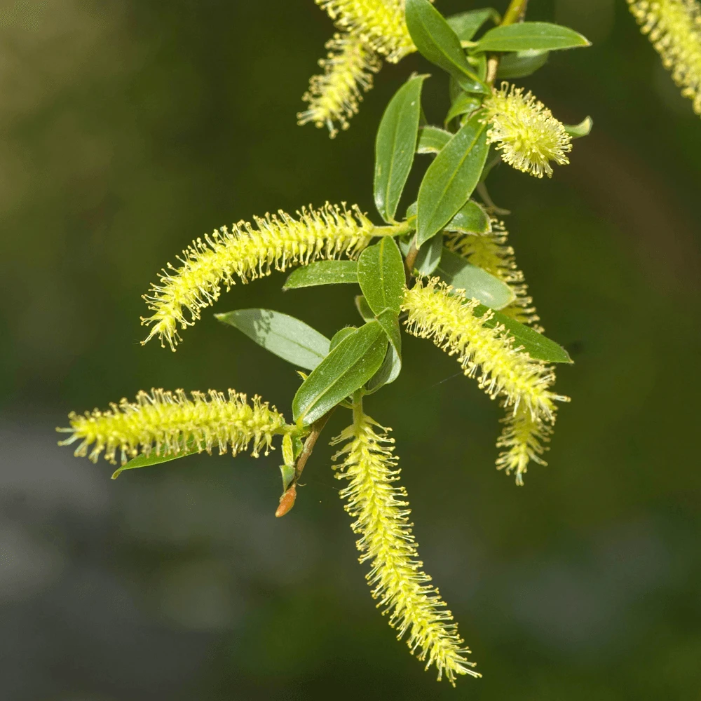 Golden Weeping Willows are known for their long, sweeping gold branches that touch the ground. The arched branches create a dome that is covered with swathes of golden-green leaves forming a natural leafy curtain. Listen for the delightful rustling sound of the leaves as the wind blows through the branches! In April, yellow catkins appear, adding further interest to this imposing tree. When the leaves fall in winter, the rugged bark is exposed, offering an awe-inspiring skeleton shape in golden tones.