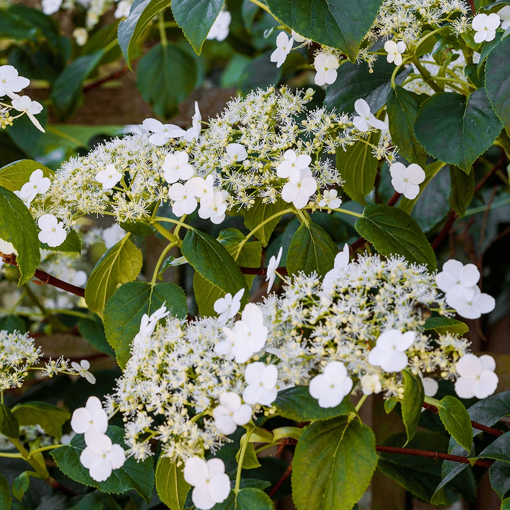 Hydrangea plant is native to the forests in Japan and Korea. Mind it, this Hydrangea Petiolaris is a vigorous woody climbing vine and can grow as tall as 15 metres if supported well. Its ability to cling to its support and to the stems using an aerial root system is impressive.