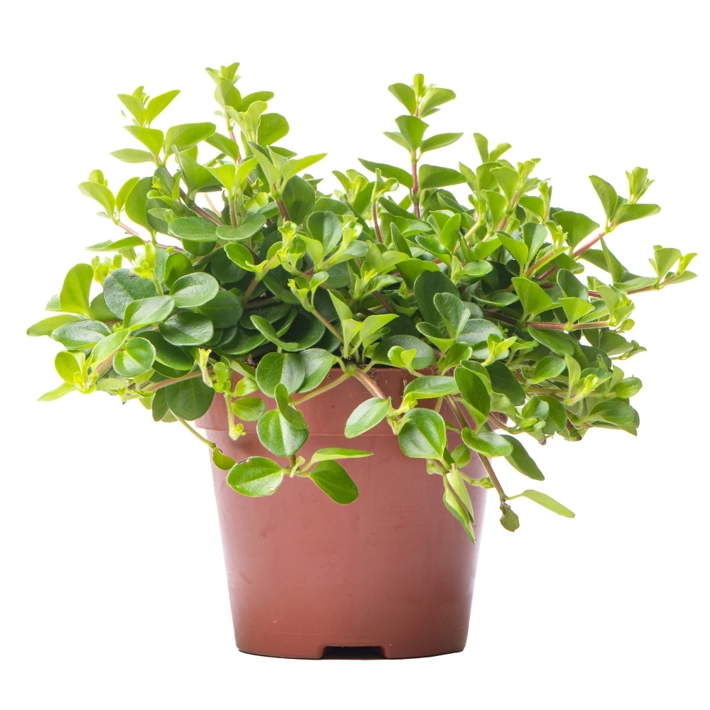 Peperomia rotundifolia, commonly known as Trailing Jade, is another small plant within the Peperomia genus. Its simple, bright green foliage gives it a vibrant look, but its trailing nature means it is great for small areas to hang off of shelves, desks, window sills or in an alcove. The plant will bear plump leaves in its younger age, before gaining a softer feel later down the line, allowing the plant to cascade freely.