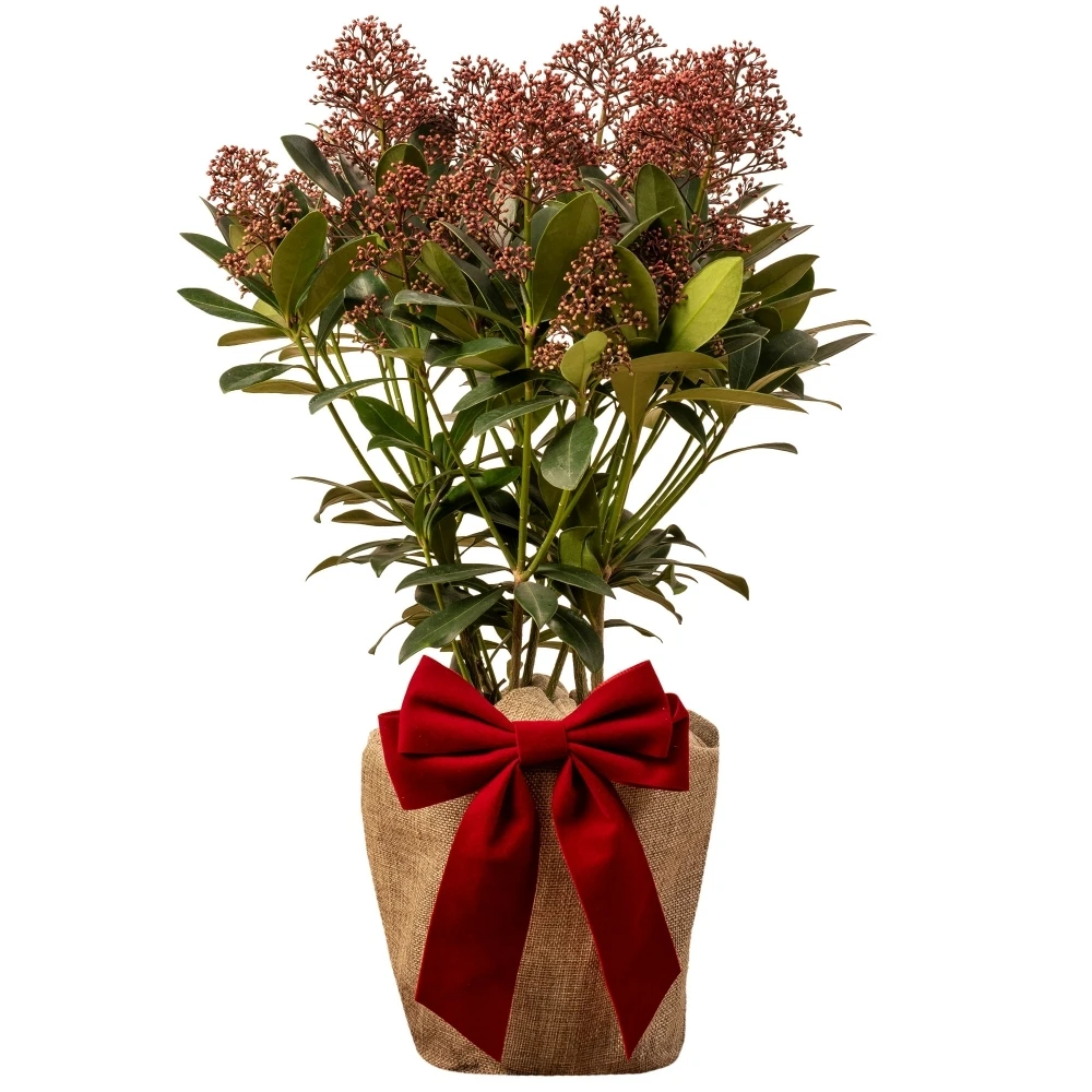 This Skimmia Rubella is a beautifully bushy plant with white flowers blooming in abundance from red buds in Spring. Complete with a gift bag and seasonal red bow, this plant would make a beautiful Christmas gift for the gardening and plant lover in your life to enjoy long after the festive season. Position the Skimmia in areas receiving partial shade, shielding it from the harshness of direct sunlight. A well-drained, consistently moist soil is key to its thriving, necessitating regular watering, especially during the drier phases of its inaugural growth year.