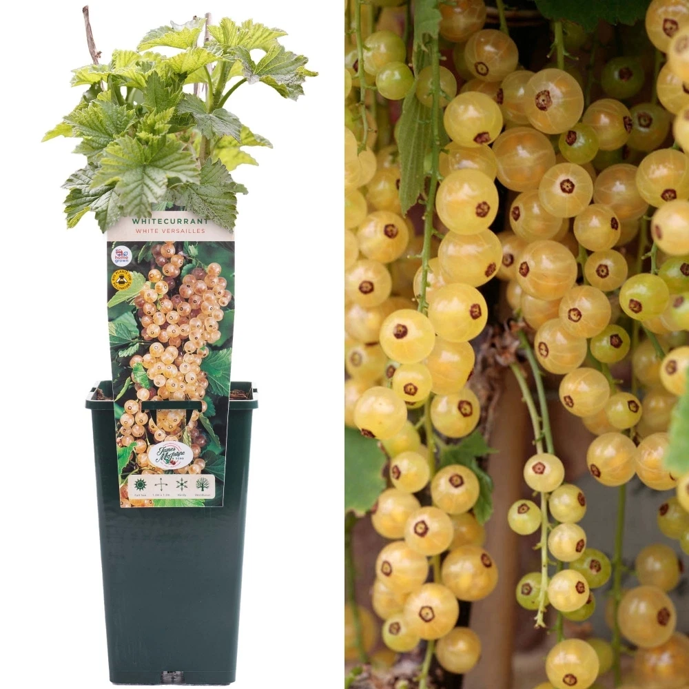 Our Ribes rubrum White Versailles is a deciduous shrub. This early cropping variety produces tasty Whitecurrants that will be ready to harvest in July and August. Small, white flowers will begin to bloom in April and May, contrasting perfectly against the plants green foliage. Whitecurrants are known to be deliciously sweet, making them ideal for including in puddings, jellies or eaten individually, straight after picking.